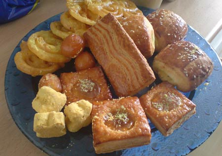 Men gott var det och oj vad vi åt, ändå blev det massor över. En favorit sedan tidigare är kikärtskakorna (längst ner till vänster på bild) men det var kul att få prova på annat också. Någon som har koll på vad de olika kakorna heter? De fyrkantiga i mitten heter, om jag minns rätt, Danmarki (efter wienerbröd med sylt i som tydligen alltid är kopplat till Danmark).